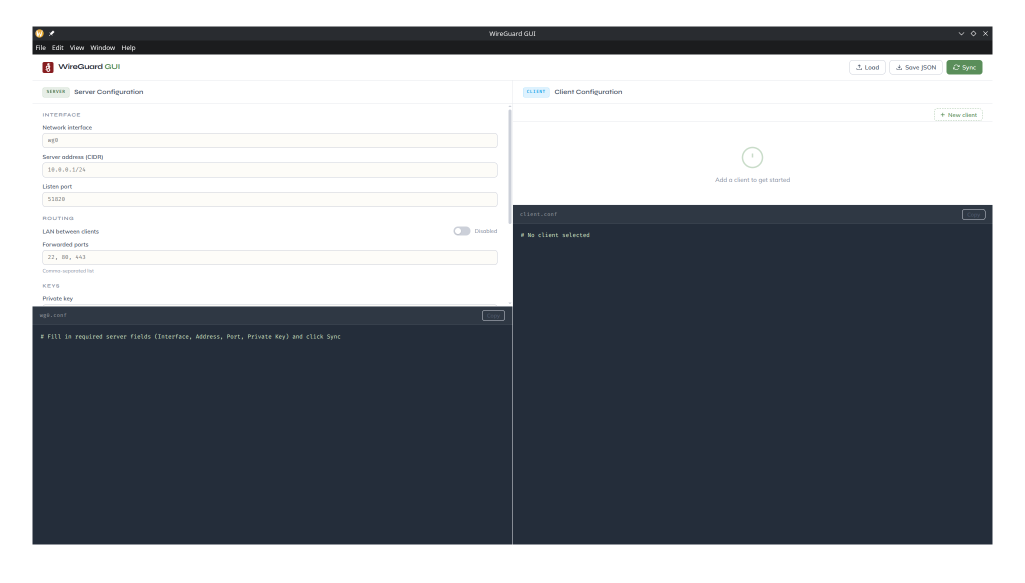 1. Fill in the Server panel on the left -> interface, address, port, keys, and any optional settings